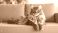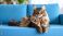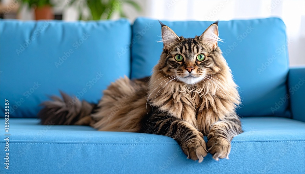 • Fluffy Maine Coon cat resting comfortably on a vibrant blue sofa in a cozy living room.