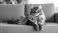 Obrazy Koty - Fluffy Maine Coon cat resting comfortably on a vibrant blue sofa in a cozy living room. #1598253587