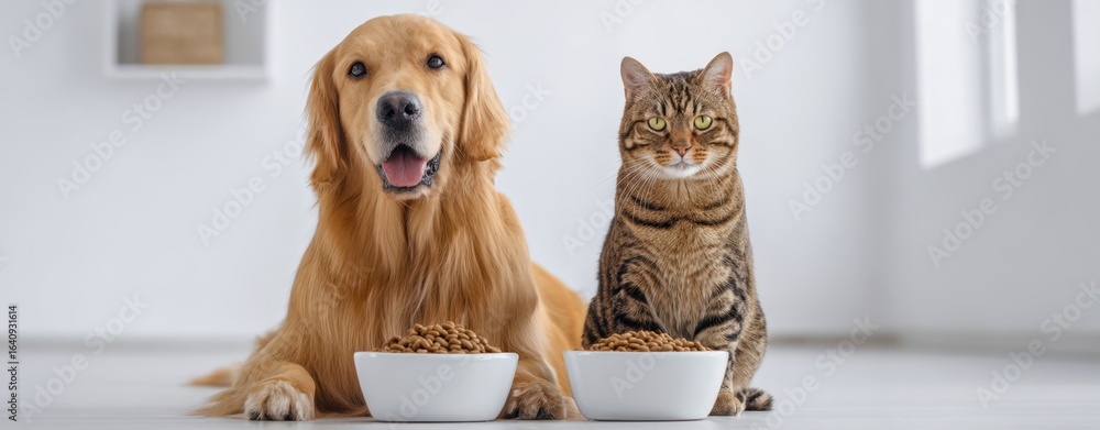 Obrazy Koty - The dog and cat happily sharing their meal in a bright home setting. #1640931614