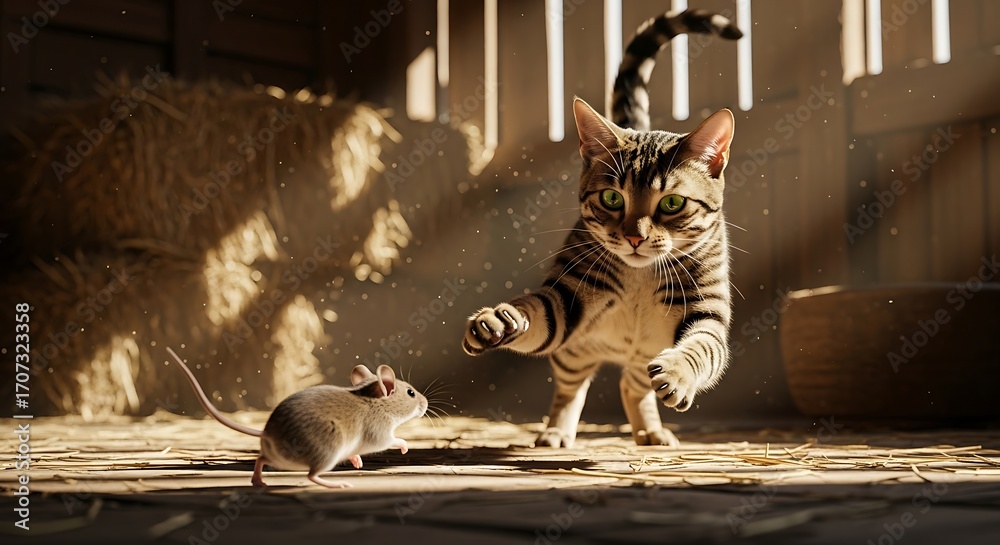 Obrazy Koty - A tabby cat stalking a small mouse in a barn. #1707323358