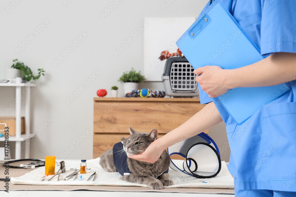 • Female veterinarian with clipboard and cat on table after sterilization in vet clinic