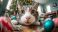 Obrazy Koty - A playful cat lies close to brightly colored Christmas ornaments scattered on the floor. The cozy... #1858540308
