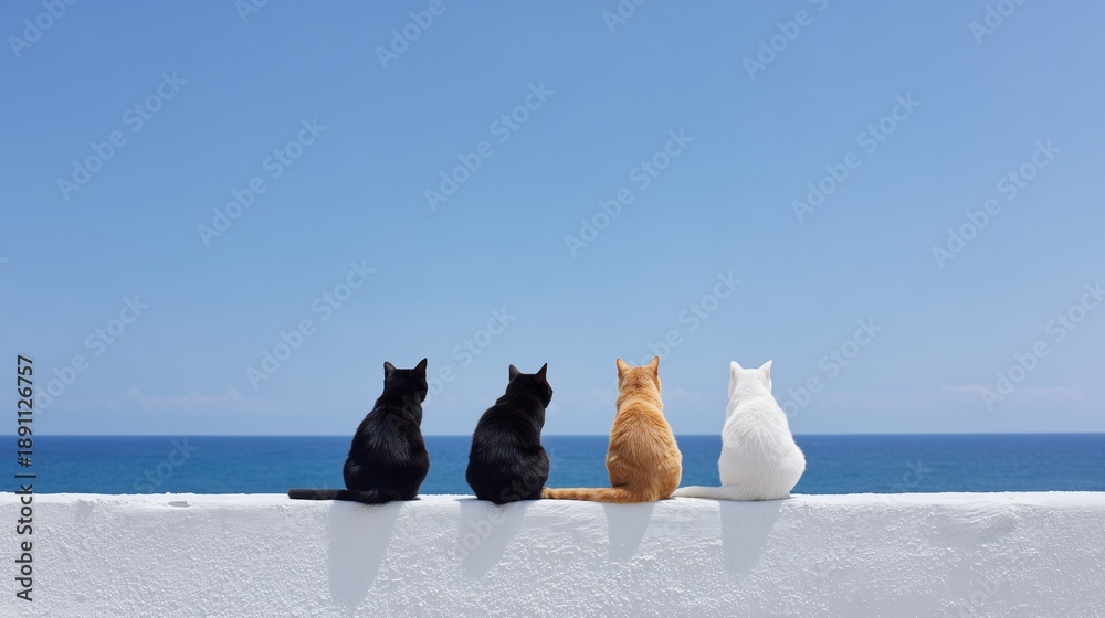 Obrazy Koty - Four cats sitting together on a white wall, looking out at the calm blue sea #1891126757