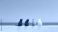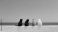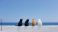 • Four cats sitting together on a white wall, looking out at the calm blue sea