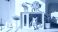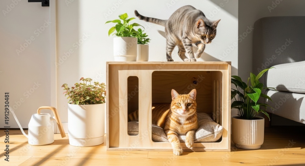 • Two domestic cats, one tabby and one ginger, interacting with a modern wooden cat house and green potted plants in a sunlit home interior.