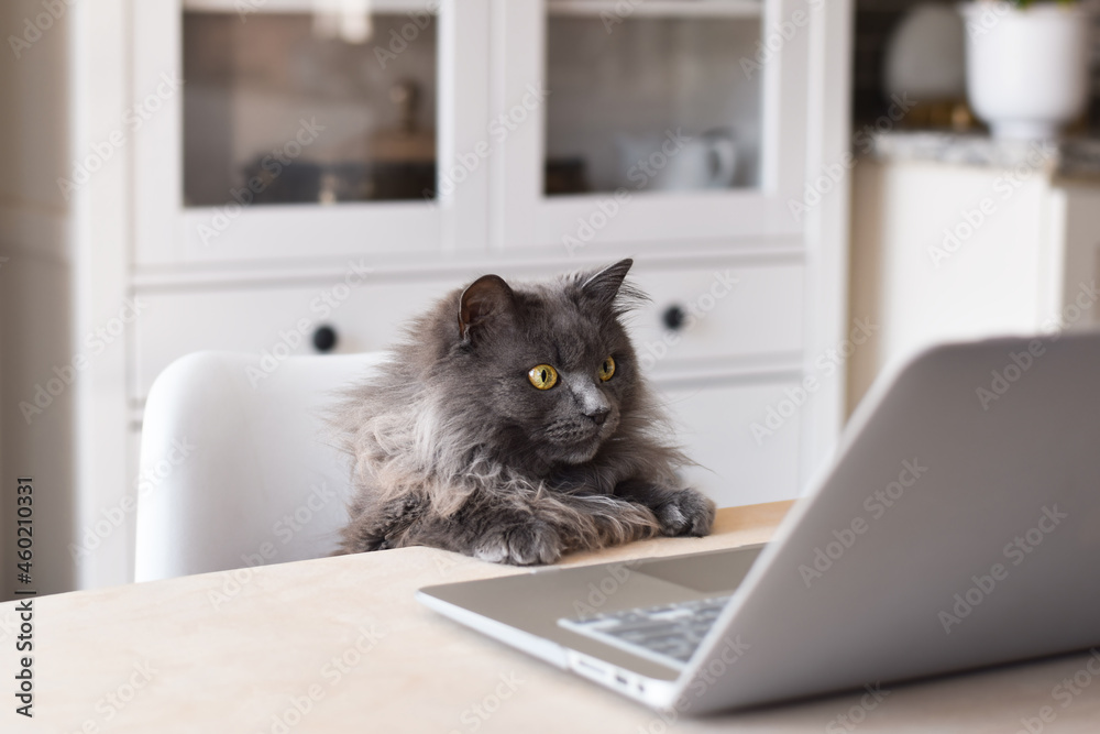Obrazy Koty - Cute funny grey cat sitting at desk watching something on laptop computer #460210331