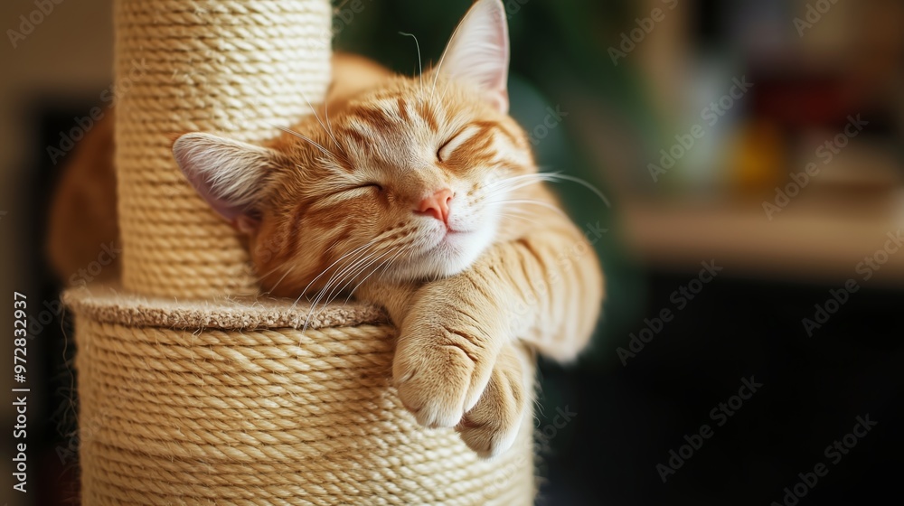 Obrazy Koty - A relaxed orange cat peacefully sleeping on a scratching post in a cozy indoor setting #972832937
