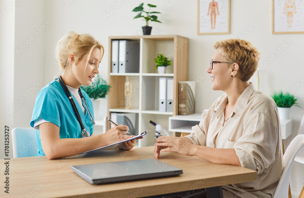 Obrazy Zwierzęta - Happy senior patient and nurse on geriatric care appointment in clinic. Young doctor listening to... #1781253727