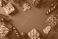 • Vibrant Christmas scene featuring wrapped gifts, candy cane, gingerbread figures, pine needles, and holiday ornaments arranged around a green backdrop