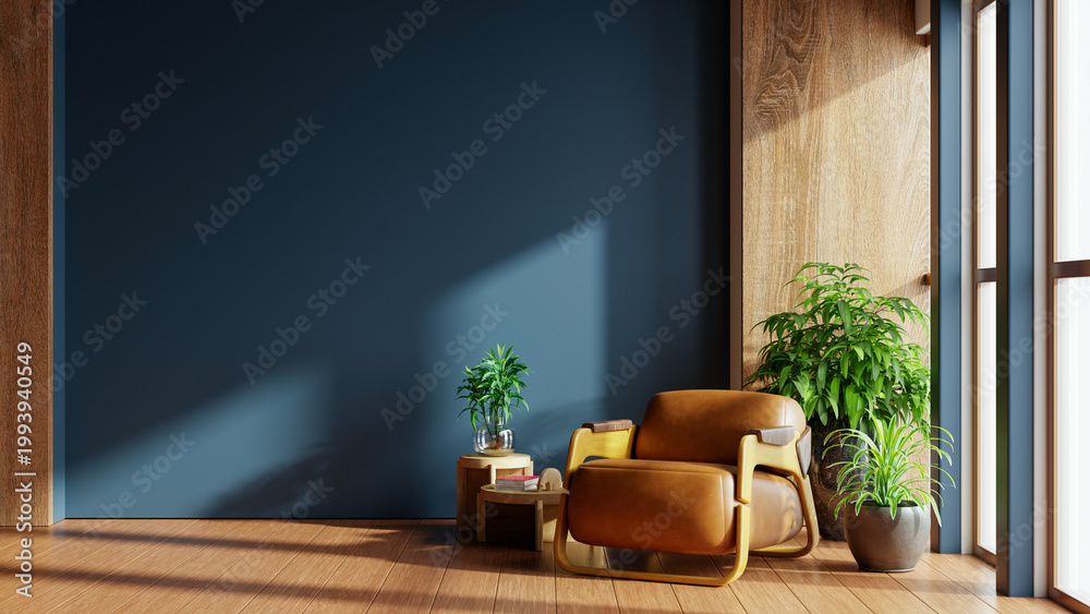 • Modern cozy living room interior design with brown leather armchair blue wall mockup and sunlight- 3D rendering
