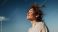 • A woman with closed eyes enjoys the fresh air, hair blowing in the breeze under a clear blue sky.