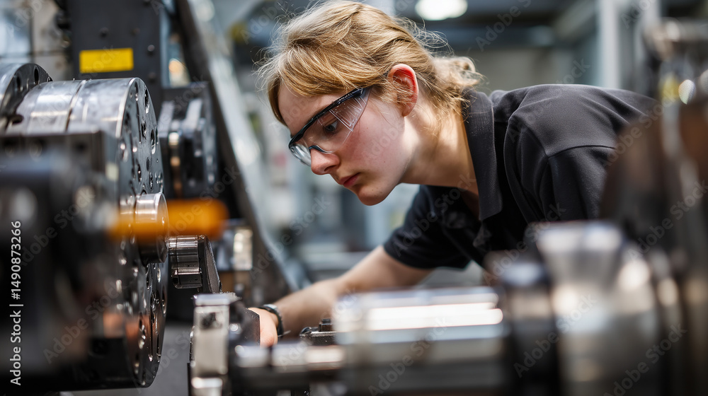 Obrazy Make up - Professional female engineer checking industrial machinery, wearing protective eyewear while... #1490873266