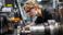 • Professional female engineer checking industrial machinery, wearing protective eyewear while working in high-tech manufacturing environment