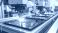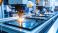• A high-tech manufacturing process showing machinery assembling circuit boards with precision and glowing elements in an industrial setting