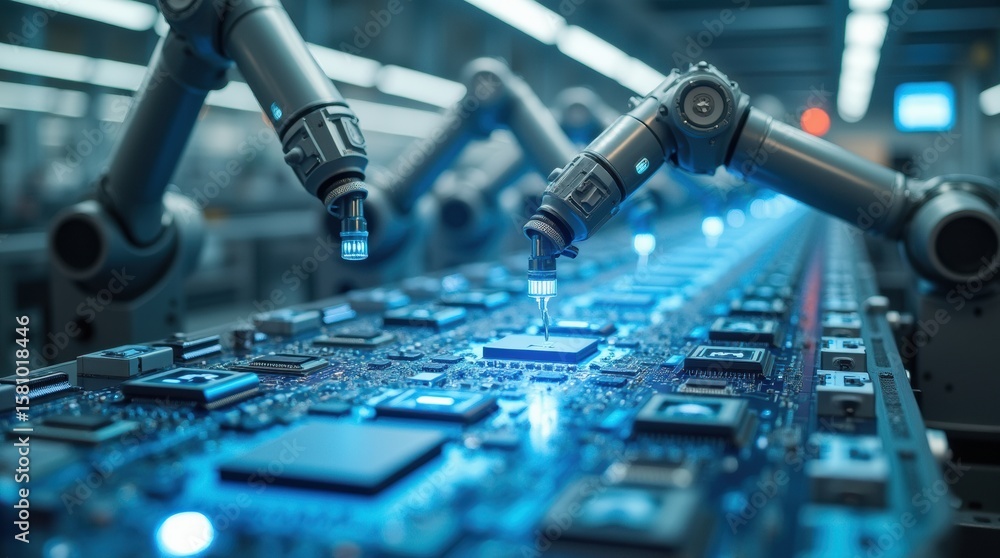 Obrazy Make up - Multiple robotic arms work on a futuristic assembly line manufacturing microchips in a bright... #1581018446