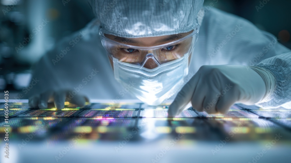 Obrazy Make up - Engineer in protective gear inspecting photonic integrated circuits under bright sterile light in... #1605496035