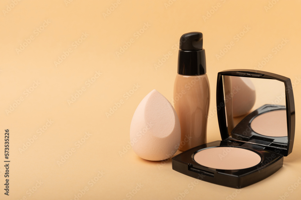 • Beauty blender for applying bb cream or concealer and cosmetics on a bright colored background. Foundation, face powder, eye shadow, blush and lash mascara. Beauty concept. Fashion. Place for text.
