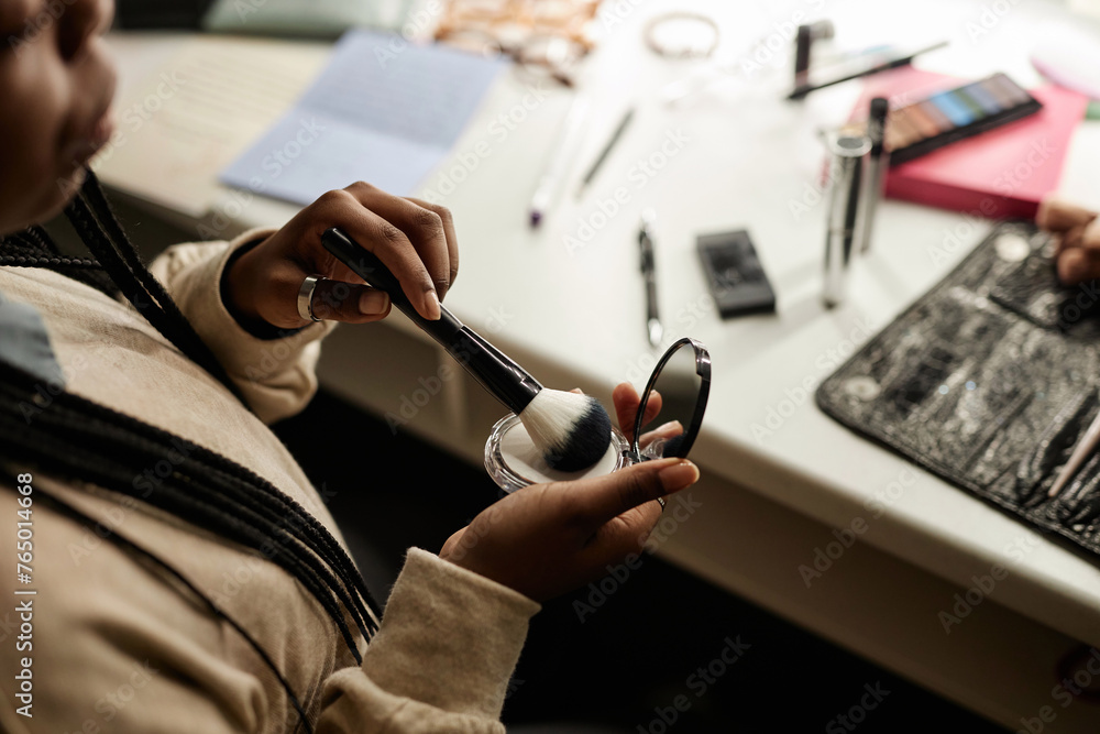 Obrazy Make up - High angle closeup of woman using make up powder with fluffy brush while sitting at vanity table... #765014668