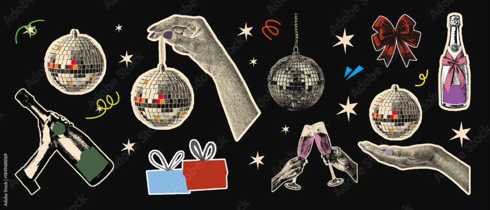 • set of Hand holding disco ball halftone collage art cutouts. retro vintage dot texture vector illustration. gift box, red bow, champagne glass, wine, cocktail for New Year or birthday party.