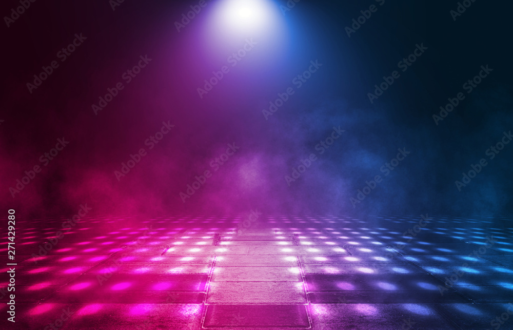 Obrazy Disco - Empty background scene. Dark room, neon blue and pink figures in the dark, smoke. Abstract dark... #271429280