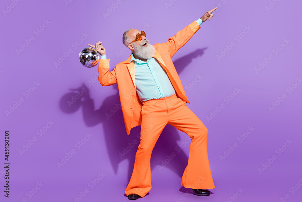 Obrazy Disco - Full length photo of old positive happy man hold disco ball point look empty space isolated on... #459130001