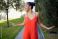 • Artistic dancer in lively posture with colorful outfit amid peaceful green scenery