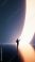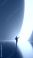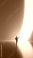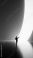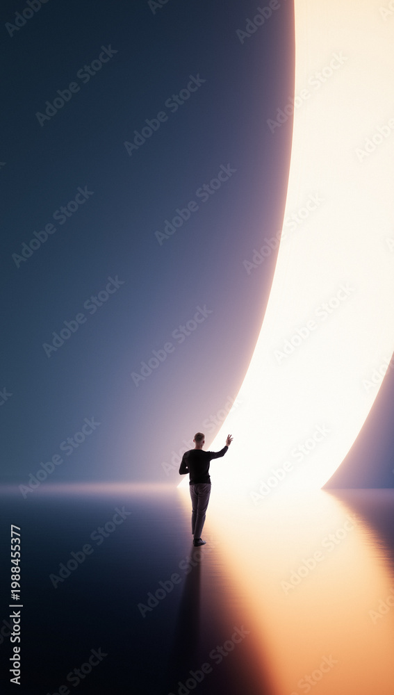 • Person approaching glowing curved portal in futuristic minimal space. Concept of digital transformation, immersive environments, future spaces, and transition into new technological realities.