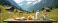 • Farm fresh organic dairy products sit on a rustic wooden table. Cows graze in a green meadow with mountains and houses in background. Natural food.