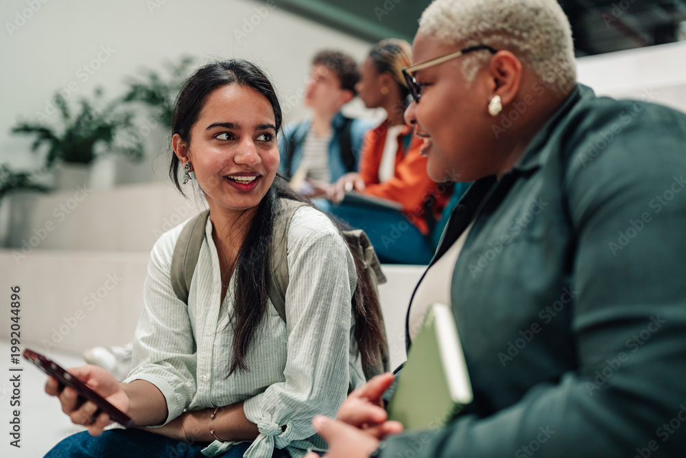 • Two diverse female students interacting and discussing on a university staircase while holding a smartphone and a notebook