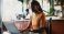 • Woman, student and laptop in coffee shop for studying, assignment review and schedule update. Typing, person and computer in cafe for assessment planning, research and essay draft for submission