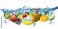 • fresh multi fruits splashing into blue clear water splash healthy food diet freshness concept isolated white background