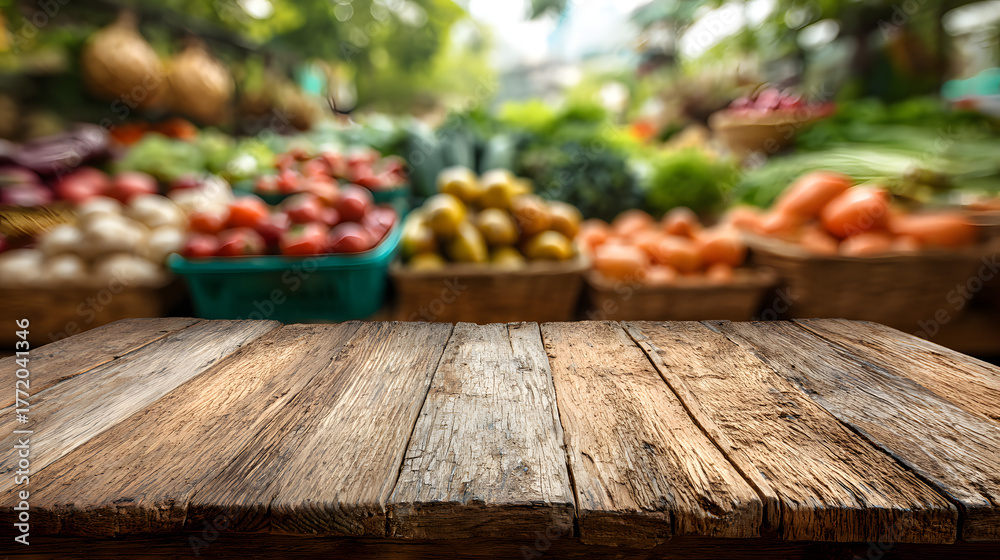 • Empty wooden table with blurred background of fresh produce at a market
