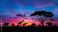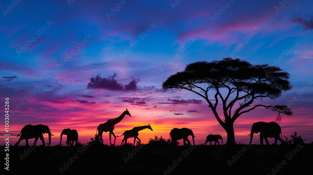• A stunning African sunset with the silhouettes of giraffes and elephants against a colorful sky. Perfect for showcasing wildlife in serene, natural beauty.