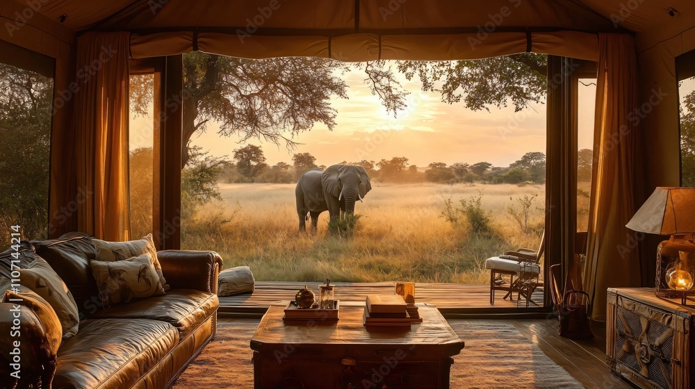 Plakat Afryka - Elephant grazing at sunset viewed from luxury safari tent #1107144214