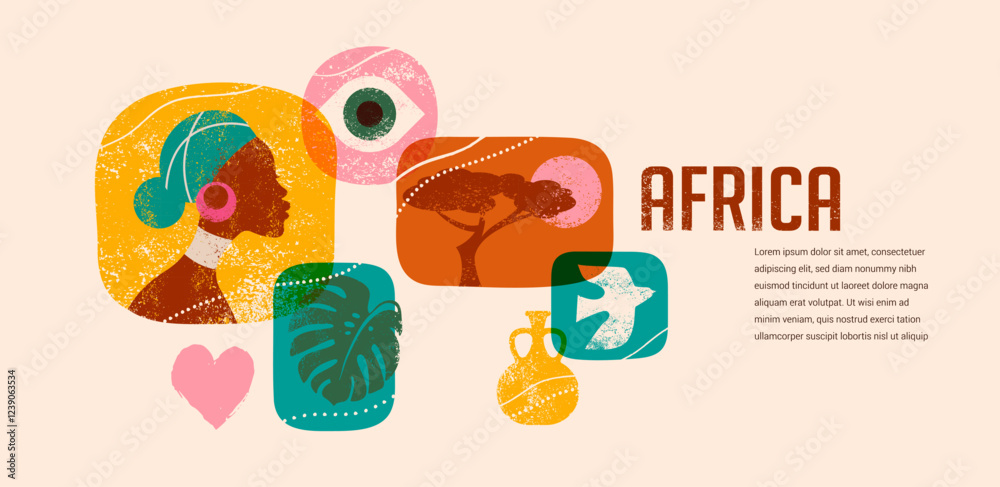 • Africa Day concept design. Africa month banner, poster with tribal patterns. Hand drawn illustration