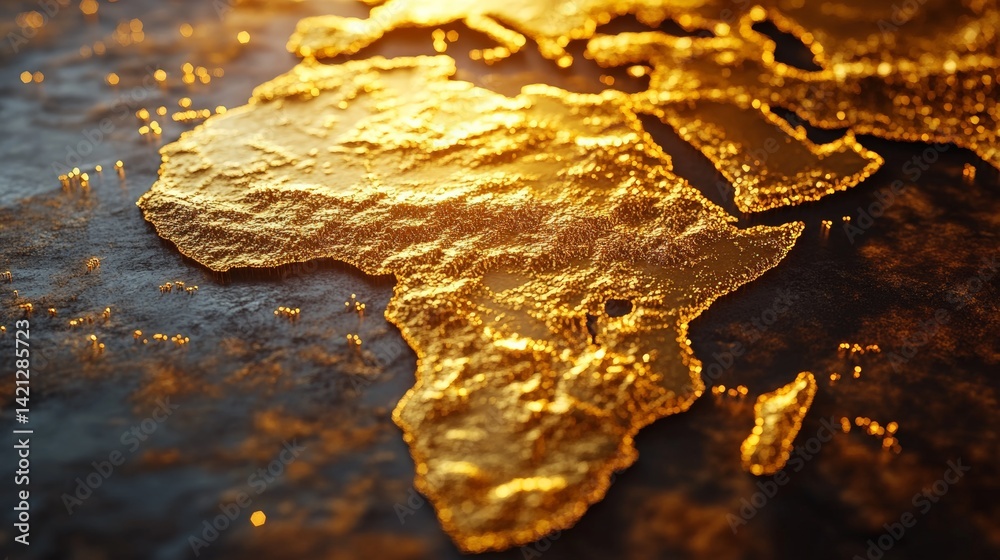 Plakat Afryka - Golden texture of africa map on black surface with illuminated highlights. Africa day #1421285723