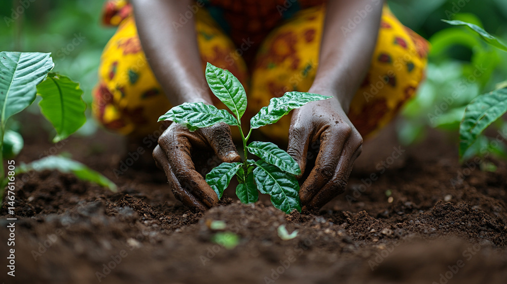 Plakat Afryka - Hands planting a coffee seedling in rich soil. #1467616805