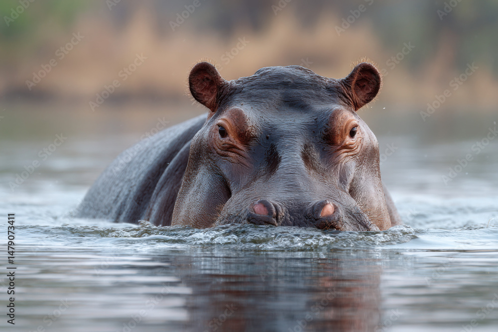 • A hippopotamus emerges from the water, its eyes focused intently on the viewer, creating a powerful and captivating image of wildlife in its natural habitat. : Generative AI