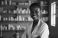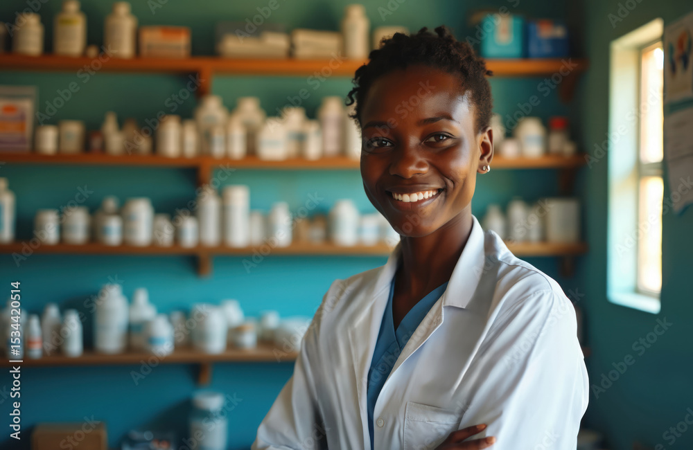 • Smiling black woman healthcare worker in clinic. Focus on providing medical care, support to community. Pharmacy bottles on shelves behind. Medical professional in lab coat provides health service.