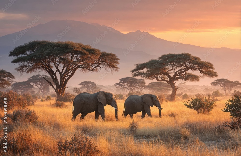 Plakat Afryka - Two elephants walking in the african savanna at sunset with mount kilimanjaro in the background #1554918919