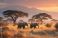 • Two elephants walking in the african savanna at sunset with mount kilimanjaro in the background