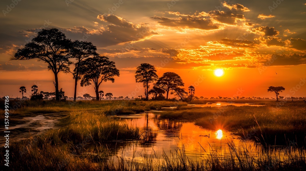 Plakat Afryka - Vast African Landscape Featuring Moremi and the Okavango Delta Amid a Golden Sub-Saharan Safari... #1574999786