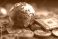 • World economy represented by a globe showing continents, stacked coins, and paper currency