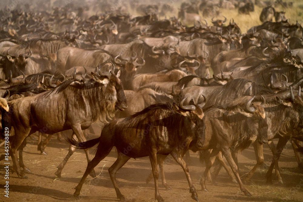 Plakat Afryka - Wildebeest Herd Charging Toward the Mara River During the Great Migration, Masai Mara #1645788829