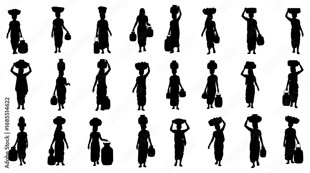 • Vector art of silhouettes of african women carrying water pots on their heads traditional village life in africa