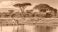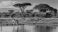 Plakat Afryka - Giraffe standing in water with reflections, an elephant nearby, and a luxury lodge. #1723201871