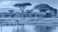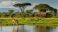 • Giraffe standing in water with reflections, an elephant nearby, and a luxury lodge.