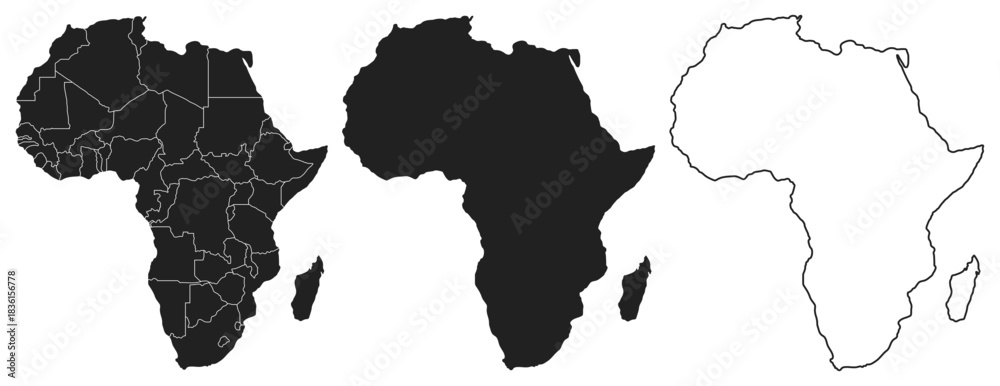 • Maps of Africa - Afrique - Afrika. Outline, line, black, silhouette, Vector