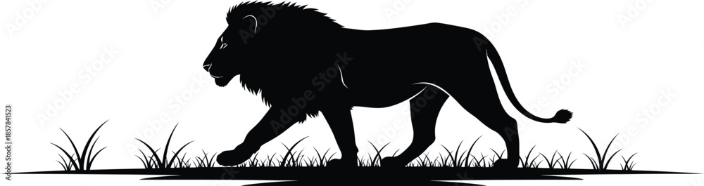 • Majestic lion silhouette walking through grassy savannah landscape