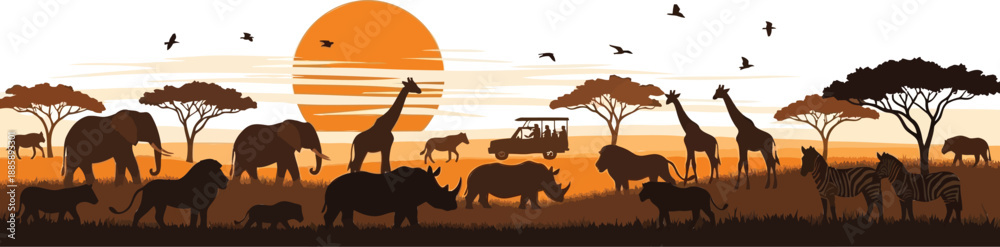 • Savanna landscape silhouette vector with acacia trees and wild nature.